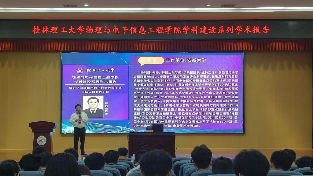2024年5月19日上午,我院特邀中南大学物理学院院长孙克辉教授,安徽大学电子信息工程学院副院长(主持工作)杨利霞教授在雁山校区图书馆报告厅,为我院师生分别作题为“混沌及其在数字图像加密中的应用”、“临近空间高超声速飞行器等离子体目标电磁特性分析”的学术报告。报告会由我院副院长李明教授主持,学院部分教师、研究生和本科生聆听了报告。