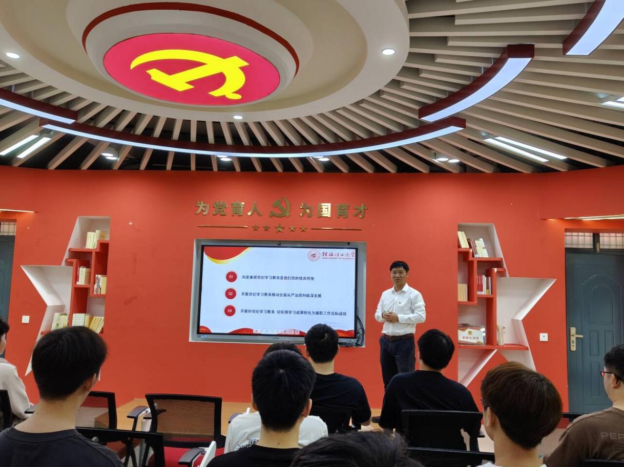为进一步深入学习贯彻习近平新时代中国特色社会主义思想,同时加强党员理想信念教育。2024年6月5日,本科生第一党支部在18栋思政大讲堂开展党纪学习教育纪律党课活动。本次党课由董明刚副院长(主持工作)主讲,支部全体在校党员同志参加学习。