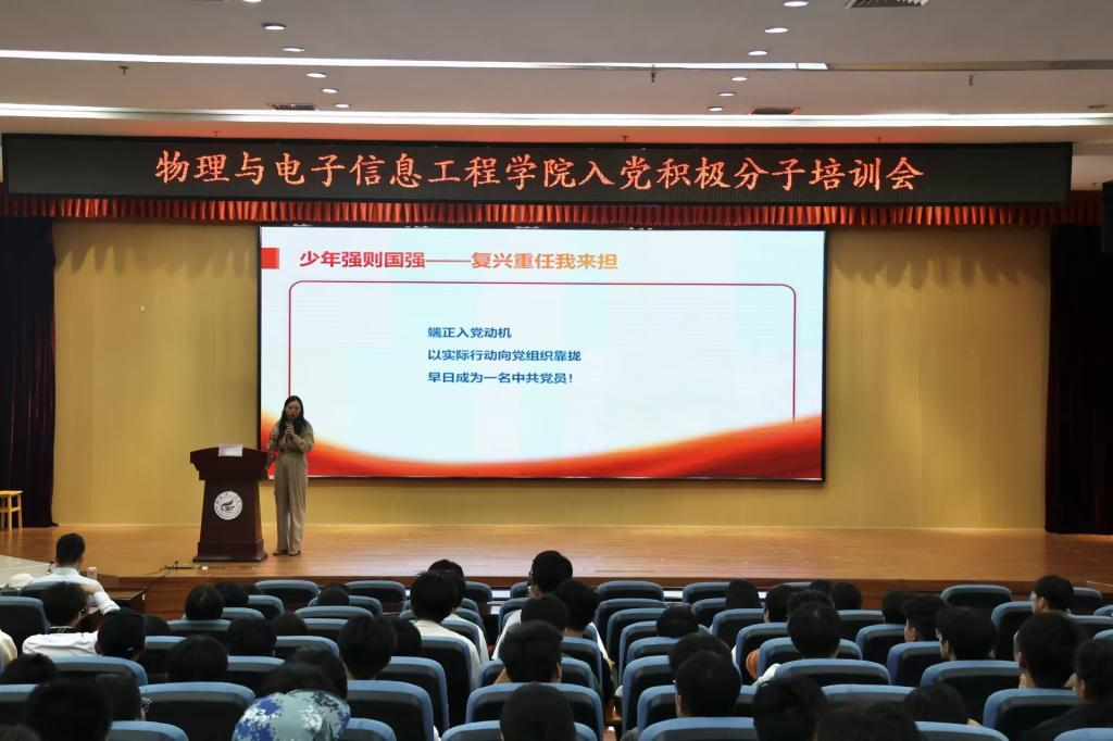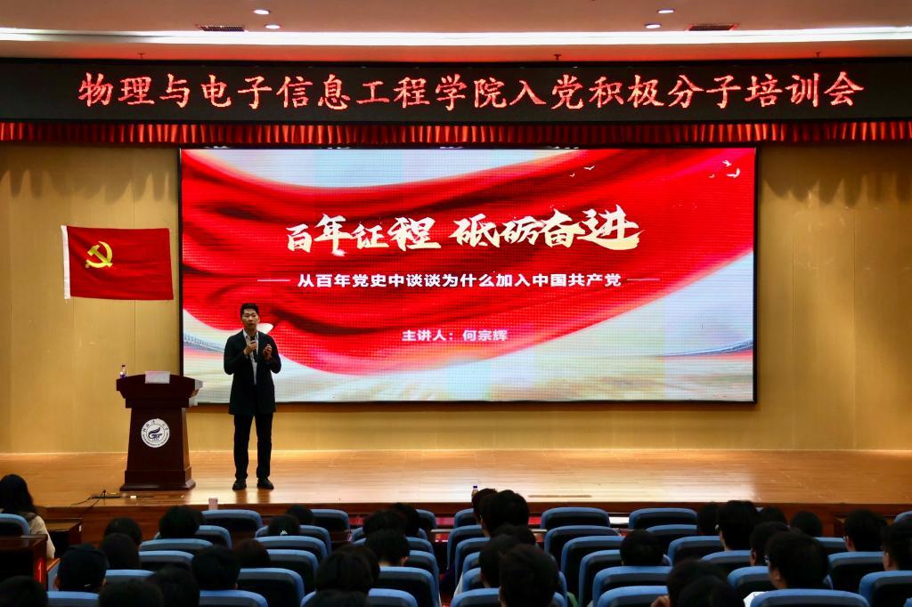 为端正入党动机,巩固党的理论知识,beat365手机版官网入口党委于10月29日中午在雁山校区图书馆报告厅举办2024年秋季学期入党积极分子培训会。学院党支部书记、低年级入党积极分子参加了培训,会议由学院专职组织员、研究生党支部书记夏琳同志主持。本次培训会采取学院集中培训和各党支部分散学习相结合的方式,主要包括专题辅导报告、视频教学及现场教学等内容。 培训会第一环节邀请了学校党委组织部何宗辉同志作辅导报告。何宗辉同志以《从百年党史中谈谈为什么加入中国共产党》为题带领我们回顾了百年党史,带领同学们从优秀共产党员的事迹中,汲取前行的智慧与力量,鼓励同学们未来以实际行动践行共产党人的初心与使命,彰显先锋形象。 随后,学院学生党务中心程登月同志就积极分子值班制度以及发展党员的条件进行说明。为入党积极分子接下来提供了努力方向。 本次培训会有效引导了积极分子树立正确的入党动机,坚定理想信念,为我院发展合格的共产党员打下坚实的基础。 会议现场(一) 会议现场(二) 会议现场(三) (一审:夏琳,二审:蒋琼,三审:秦勤忠)