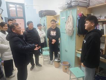 走访过程中,学院领导与同学们亲切交流,详细询问了他们的学习、生活情况以及遇到的困难,并认真听取了学生对宿舍环境、校园设施、学院服务等方面的意见和建议。秦勤忠书记表示,学院始终坚持以学生为中心,致力于为同学们创造舒适、安全的学习和生活环境,帮助大家更好地成长成才。董明刚院长还特别关注了宿舍的卫生状况、设施维护以及消防安全等问题,叮嘱同学们要养成良好的生活习惯,注意宿舍卫生,加强安全意识,共同营造文明、和谐的宿舍氛围。