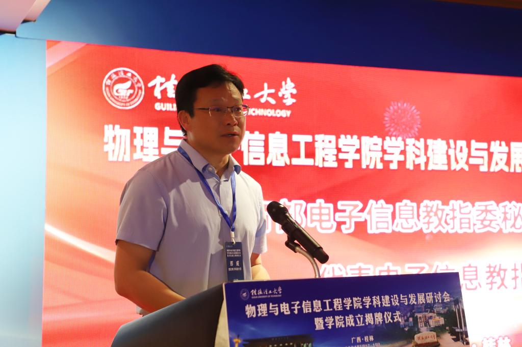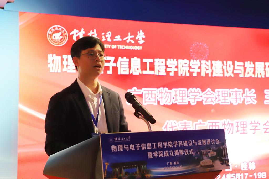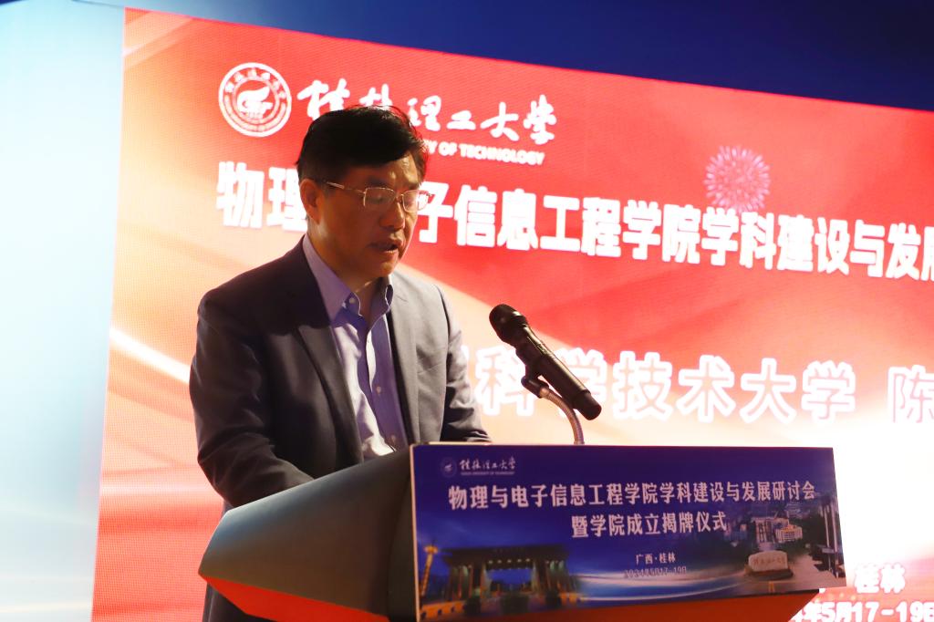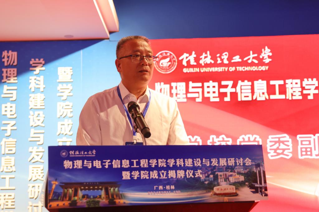 邓成教授在致辞中指出,beat365手机版官网入口的成立是桂林理工大学贯彻落实党中央加强基础研究重要战略部署,顺应国际科技发展主流,深化学科交叉融合的一个创举。学校打破学科专业壁垒,把物理学学科、电子信息类学科放在一个学院统筹谋划、共同建设,为学科交叉融合、共生发展提供了良好的土壤环境。