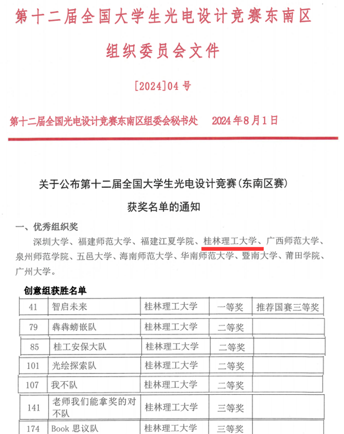 第十二届全国大学生光电设计竞赛东南赛区决赛于2024年7月30日在广西师范大学圆满落幕。来自广东、广西、福建、海南4省(自治区)的43所高校、326支队伍同台竞技。通过激烈竞争,由我院光电设计竞赛指导教师团队带领的队伍获得了一等奖1项、二等奖4项、三等奖2项的好成绩,获得一等奖的队伍被推荐为国赛三等奖。我校在该赛事中首次获得优秀组织奖。