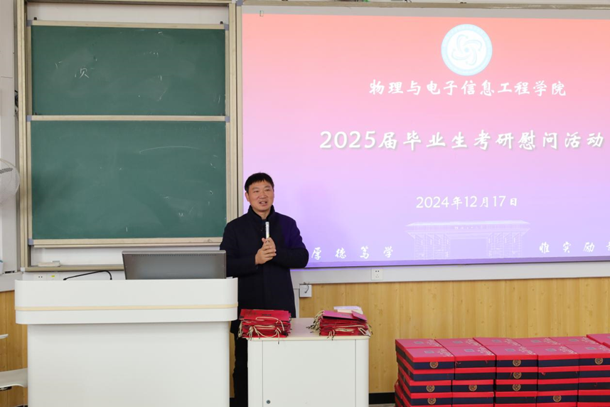 2024年12月17日上午,学院在第五教学楼103教室成功举办了2025届毕业生考研慰问活动。学院院长董明刚、院长助理王志勇、学院毕业班辅导员以及2025届考研学子参加了活动。会议由学院党委副书记蒋琼主持。