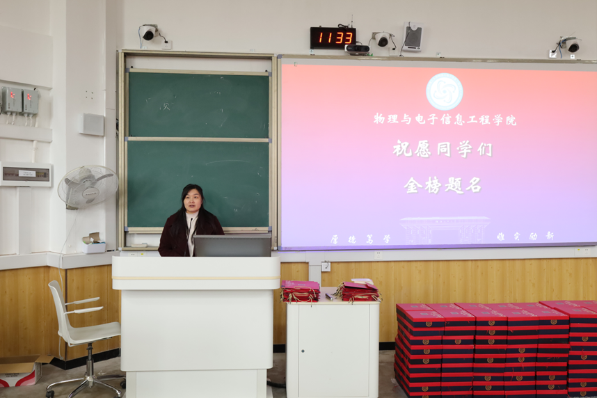 董明刚院长首先对考研学子们的辛勤备考表示了充分的肯定和赞赏,强调了考研对于个人成长和职业发展的重要性。他提到,学院一直高度重视学生的考研工作,为考研学子们提供了全方位的资源和支持。同时,他也分享了一些学院的考研成功案例,以此激励学子们继续努力,争取在即将到来的考试中取得优异成绩。在讲话结束后,学院领导亲自上台,为考研学子们发放了精心准备的慰问品,旨在表达学院对考研学子们的深切关怀和全力支持。学子们在领取慰问品时,脸上洋溢着幸福的笑容,纷纷表示将不负众望,以优异的成绩回报学院的厚爱。