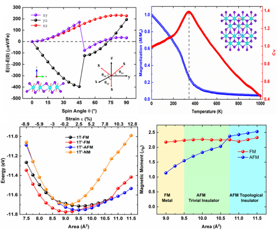 研究表明该材料的电子结构与磁性长程序密切相关,铁磁态是金属,而非磁和反铁磁(AFM)态是绝缘体。在2.5%的面内应变作用下,FM态向AFM态转变,并伴有金属-绝缘体转变。更有趣的是,通过进一步面内拉伸,拉伸应变达到~9.1%,AFM平庸绝缘态进一步转变为AFM拓扑绝缘态。