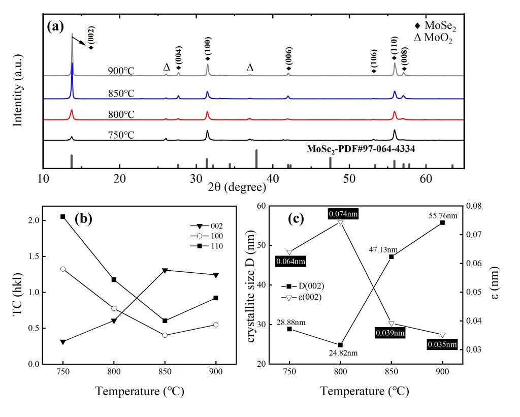 目前,制备MoSe2的方法主要有机械剥离法、分子束外延法、水热法、化学气相沉积法等。本工作采用磁控溅射结合化学气相沉积方法制备MoSe2薄膜。研究发现,随着硒化温度的升高,MoSe2薄膜的平均晶粒尺寸先略减小后增大,且(002)晶面取向优先生长,其直接带隙对应的波长发生蓝移,光学带隙随之减小。表明通过改变硒化温度可以有效调控MoSe2结构和光学带隙,为MoSe2薄膜在光学器件应用方面提供更多可能。