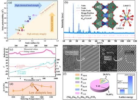 研究工作一,在钒基锆石AVO4的A位引入了价态相同但离子半径和离子极化率不同的稀土离子,设计了一种高熵陶瓷(Nd0.2Eu0.2Y0.2Ho0.2Yb0.2)VO4,极大的降低了锆石陶瓷的介电损耗。该高熵陶瓷在最佳烧结温度下的Q×f为76,400 GHz(f = 12.31 GHz),并且该Q×f值是迄今为止报道的锆石陶瓷的最高值。本研究策略和结论为开发新型超低介电损耗微波介质陶瓷提供了新思路。