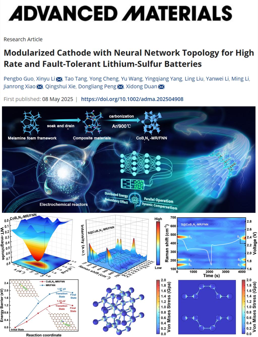 近日,我院李新宇研究员、肖剑荣教授团队在顶级期刊《Advanced Materials》(中科院一区TOP期刊,2024年影响因子27.4)上发表题为“Modularized Cathode with Neural Network Topology for High Rate and Fault-Tolerant Lithium-Sulfur Batteries”的学术成果。该研究成果首次提出了电极的容错策略并阐明了其作用机制,为储能电池的设计与安全性提供了全新的视角。