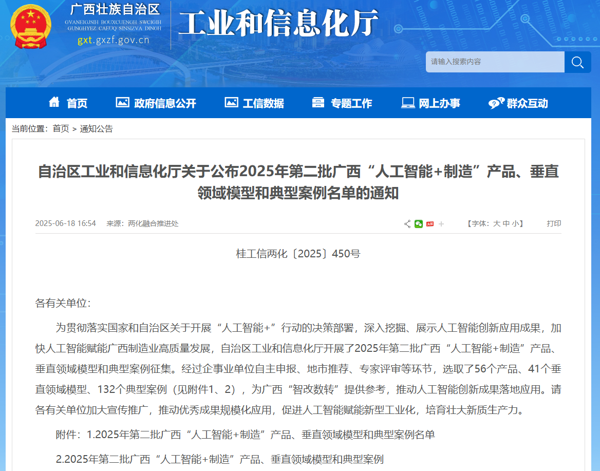 近日,自治区工信厅公布2025年第二批广西“人工智能+制造”产品、垂直领域模型和典型案例名单,我院邓健志教授团队牵头承担的“大藤峡水利枢纽船闸船舶过闸智能管理系统”项目成果,同时获得“人工智能+制造”产品、“人工智能+制造”典型案例,这是我校唯一入选的“人工智能+”应用成果。本次征集,经过企事业单位自主申报、地市推荐、专家评审等环节,全区最终选取了56个产品、41个垂直领域模型、132个典型案例。成果为广西“智改数转”提供参考,有助于加快人工智能赋能广西制造业高质量发展,推动人工智能创新成果落地应用,促进人工智能赋能新型工业化,培育壮大新质生产力。