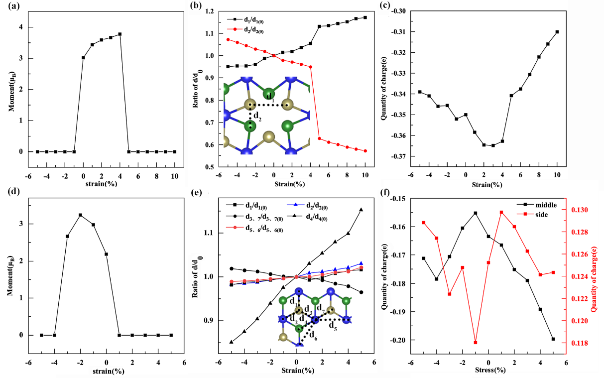 (a)-(c)和(d)-(f)分别是VTe1m和VTe7的磁矩、键长参数d/d(0)和电荷转移随应变的变化。