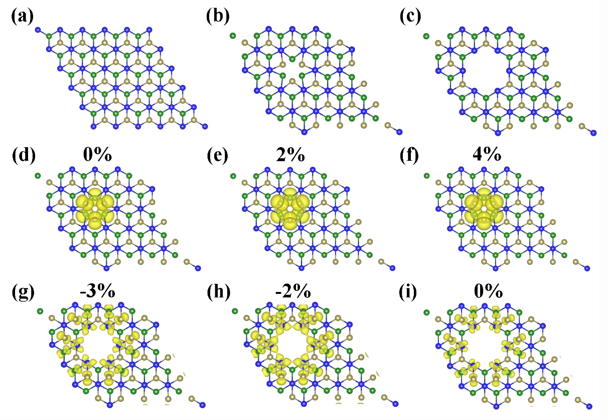 研究发现,单空位缺陷VTe1m与复合空位缺陷VTe7可分别产生3μB和2μB的局域磁矩,其根源在于空位引入的缺陷态使Te-5p轨道发生自旋极化。双轴应变可调控磁矩大小与开关状态:VTe1m在+4%拉应变下磁矩增强至3.8μB,VTe7在-2%压应变下达到3.2μB。在特定临界应变(VTe1m为-1%压应变和+5%拉应变,VTe7为-4%压应变和+1%拉应变)时磁性完全淬灭。通过揭示“键长-电荷-磁矩”耦合机制,发现应变通过改变Te原子间距,调节非成键5p电子分布,从而实现磁矩连续可调与突变淬灭的物理本质。这些研究为二维碲烯材料在自旋电子学、多态存储和逻辑器件等领域的应用提供了重要的理论基础。