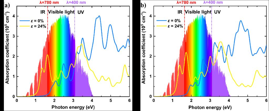 (a)和(b)为一维Bi4RuI2和Bi4RuBr2的沿链方向在无应变和24%拉伸应变下的光吸收系数