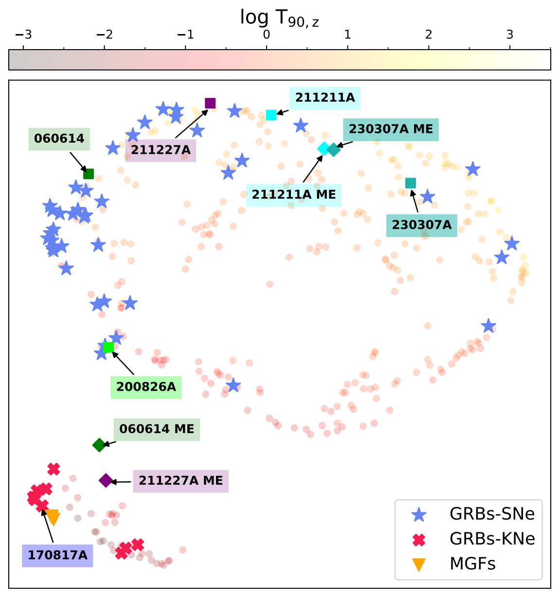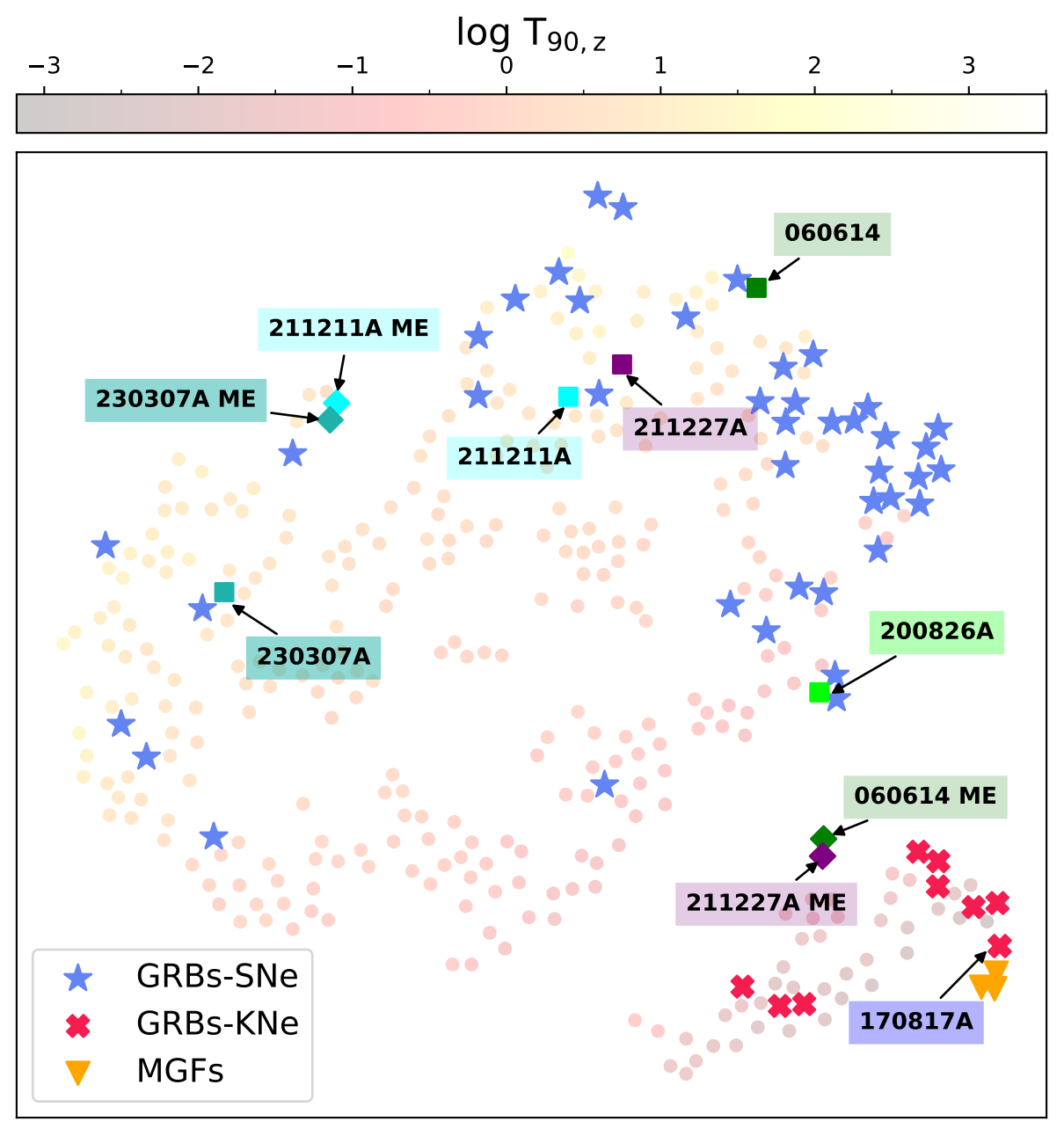 针对当前伽马暴分类中存在的混淆问题,张富文教授团队提出了一种基于无监督机器学习(包括t-SNE与UMAP方法)的分类策略,仅利用伽马暴的瞬时辐射观测数据,即可有效区分不同起源类型的伽马暴。